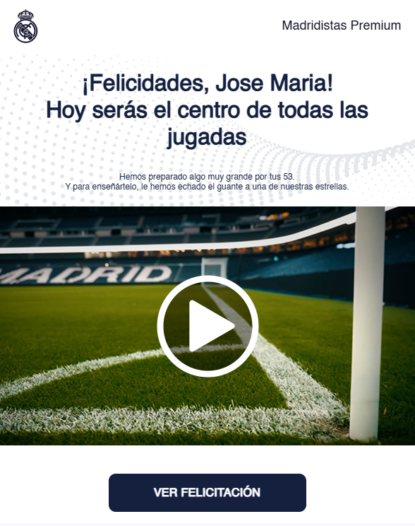 Y ese fue el encargo que nos hizo el Real Madrid para su felicitación anual por mail al más de medio millón de socios del Club Madridistas: hacer un vídeo hecho con IA que contase con un buen storytelling y lograse emocionar a los aficionados en su día.